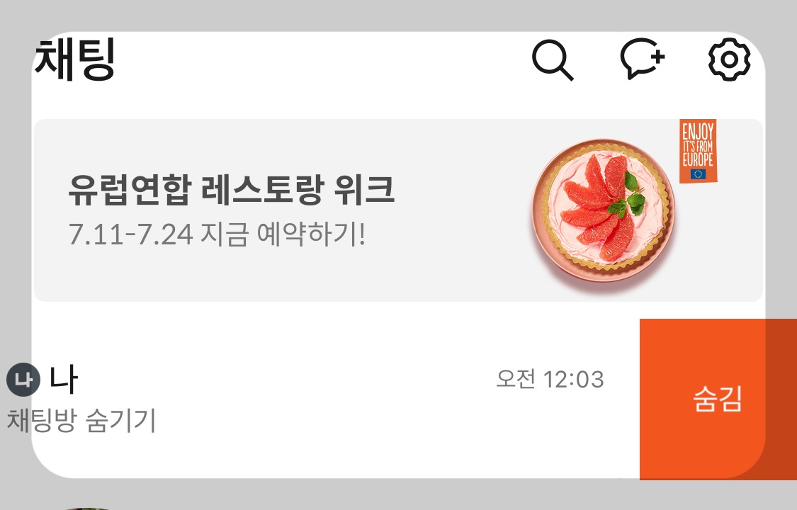 조용한 채팅방을 왼쪽으로 드레그 하면 해제, 숨김 메뉴가 뜹니다.