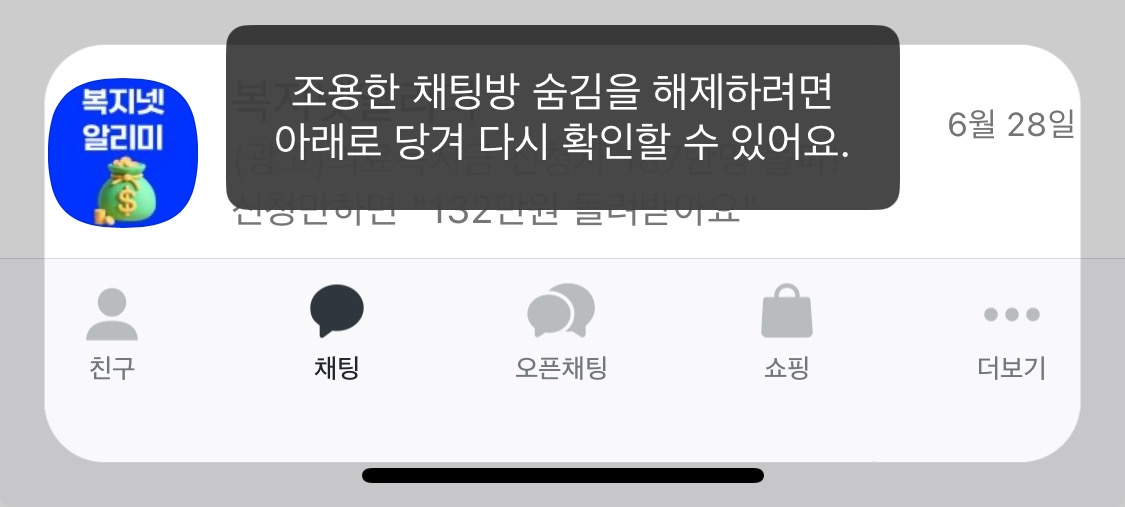 조용한 채팅방을 숨기면 위 화면처럼 해제하는 방법 안내하는 메시지가 떴다가 사라집니다.