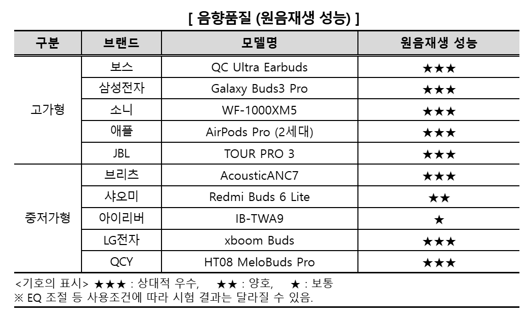 - 보스(QC Ultra Earbuds), 삼성전자(Galaxy Buds3 Pro), 소니(WF-1000XM5), 애플(AirPods Pro 2세대), JBL(TOUR PRO 3), 브리츠(AcousticANC7), LG전자(xboom Buds), QCY(HT08 MeloBuds Pro) 등 8개 제품이 음의 왜곡이 적어 상대적으로 우수한 것으로 평가됨.