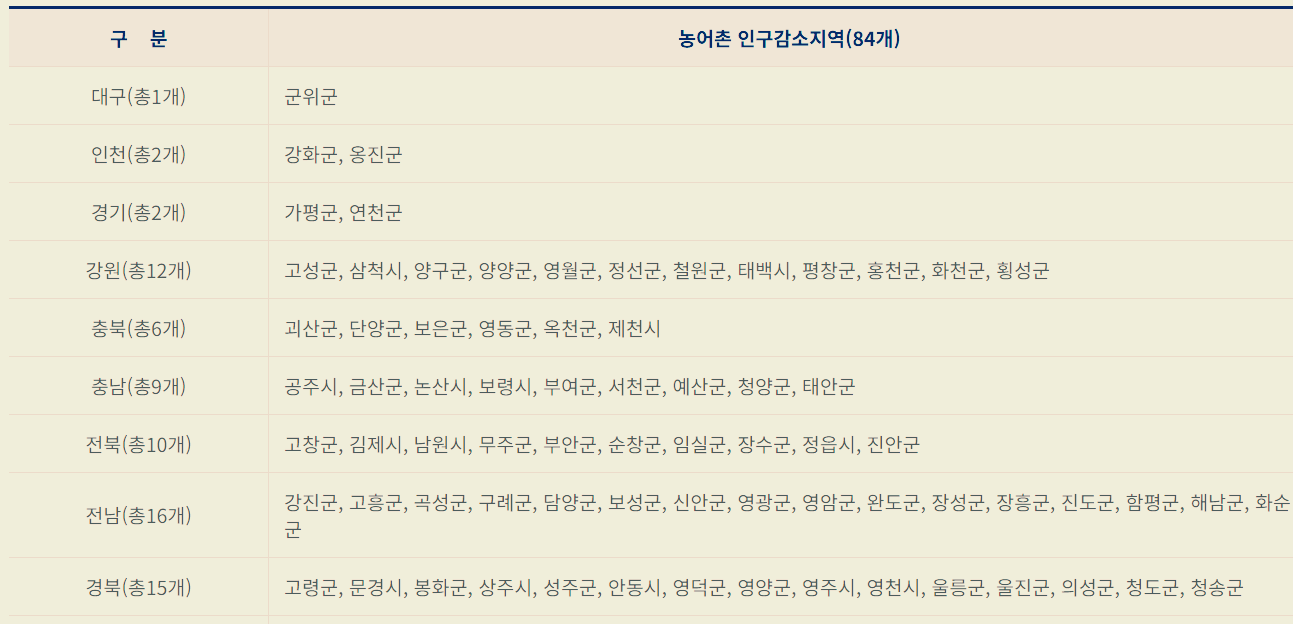 1차 민생회복 소비쿠폰의 경우 농어촌 인구감소지역(시·군 지역 인구감소지역) 주민에게 5만원을 추가 지급할 예정으로, 기준일(6.18.) 기준 해당 지역은 다음과 같습니다.