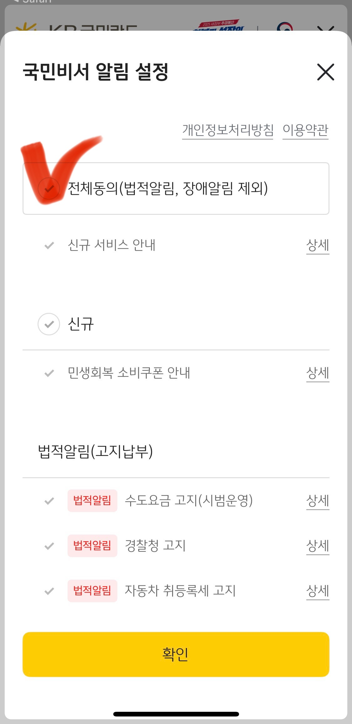 * 나는 다 모르겠고, 일단은 민생회복 소비쿠폰에 대한 알림 신청하는 게 최우선이다, 라고 하시는 분은 아래 화면에서처럼 전체동의에 체크해주세요. 괄호에 보이듯이 그 외 알림은 제외한다는 의미입니다.