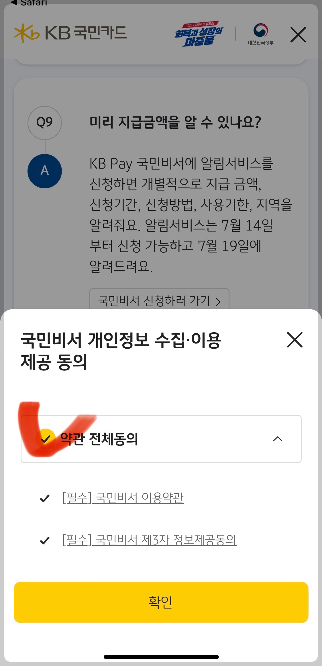 7) 국민비서 개인정보 수집이용에 동의하시는데, 필수항목이라 여기서는 전체 동의 선택해주세요.