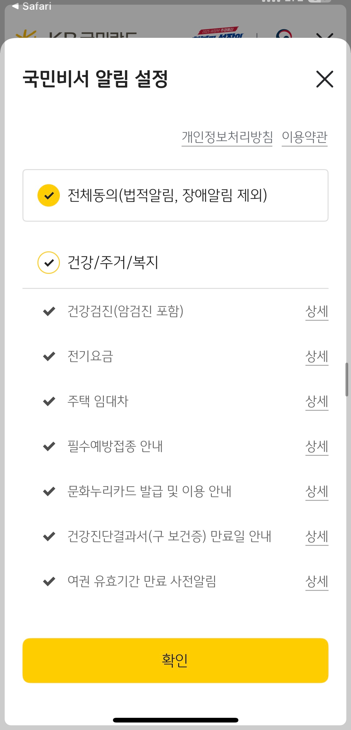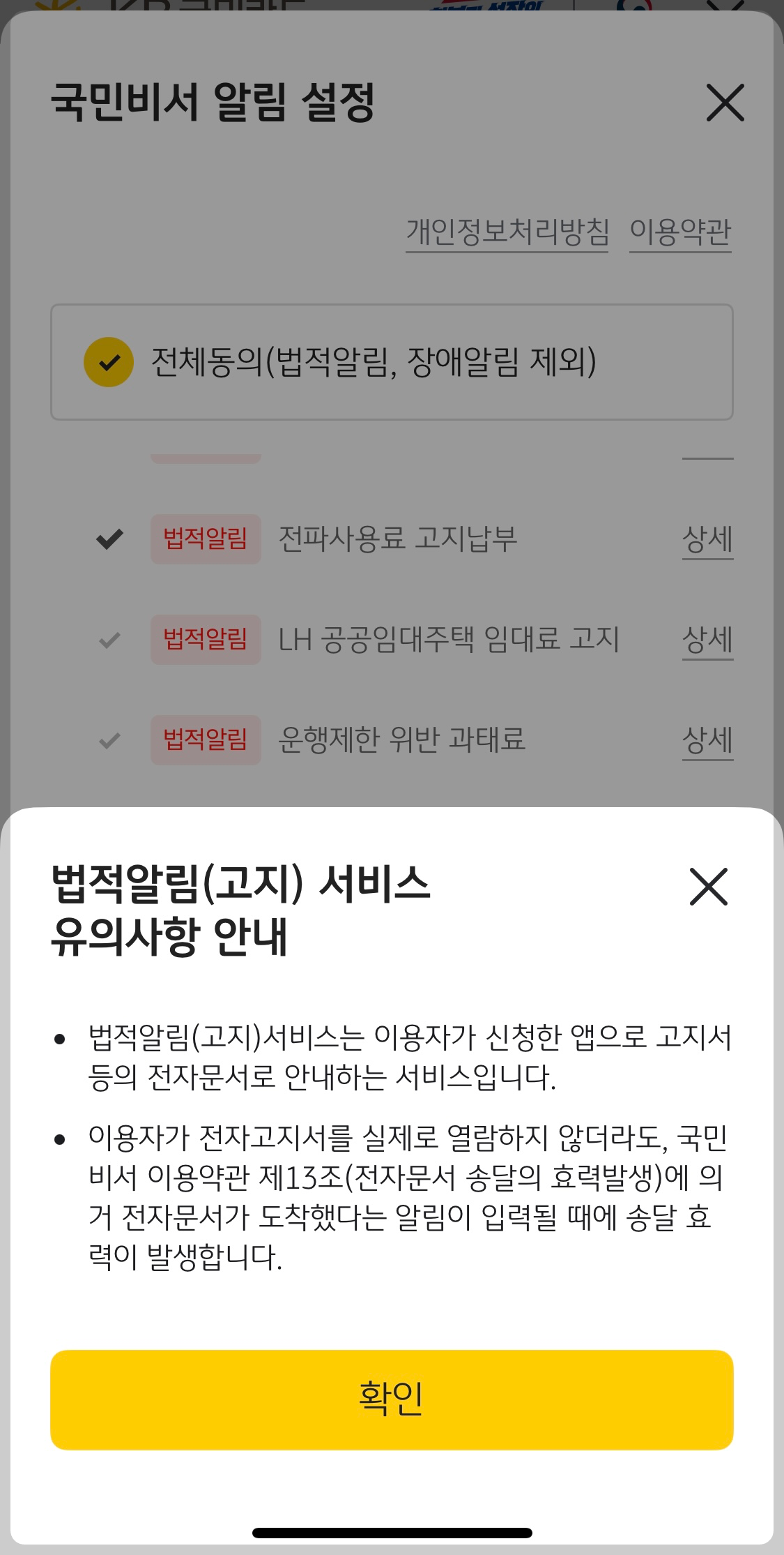8) 다음은 국민비서 알림설정 입니다. 여기서 어떤 알림들을 설정하느냐에 따라 시간이 짧게 걸릴수도, 길게 걸릴 수도 있어요.