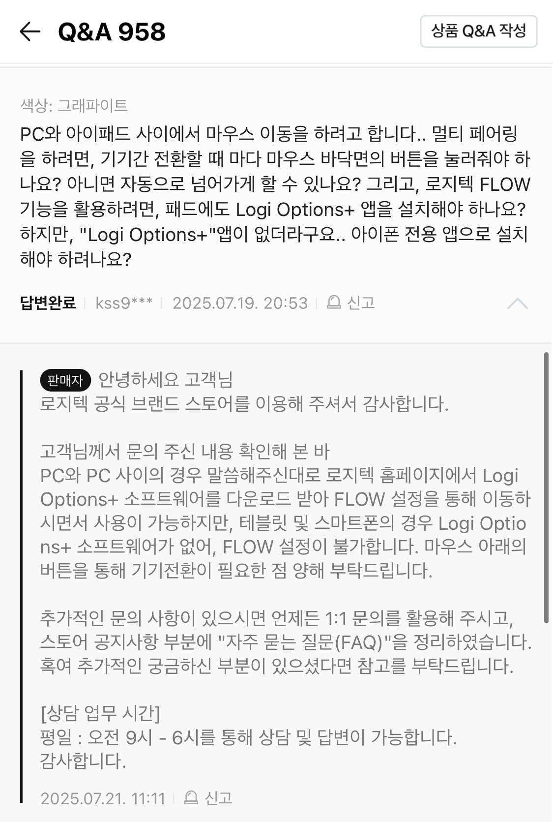 아쉽지만, 로지텍 max master 3s의 플로우 기능은 다른 윈도우와 윈도우 혹은 아이패드와 맥고 같은 조합이 가능할 때라야 사용하게 될 듯합니다.