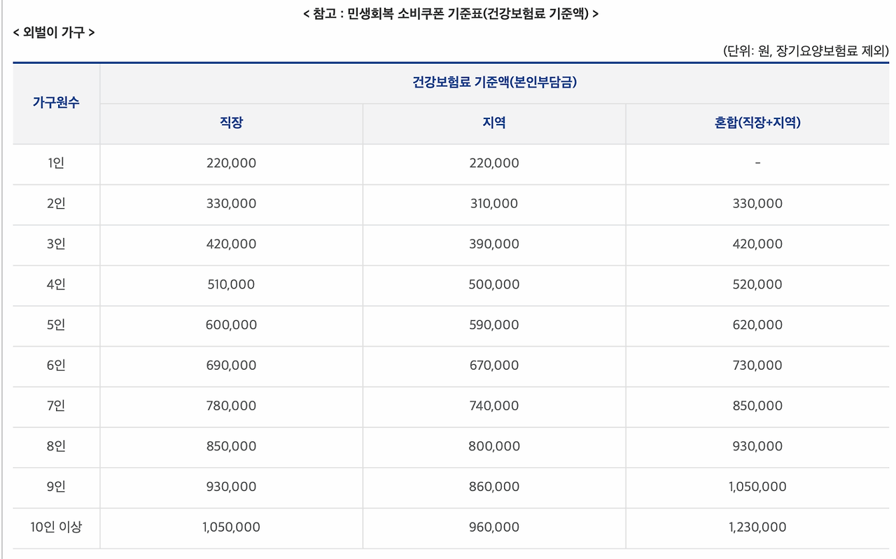 - 외벌이 가구 기준: 건강보험료가 51만 원 이하일 경우 지원 대상