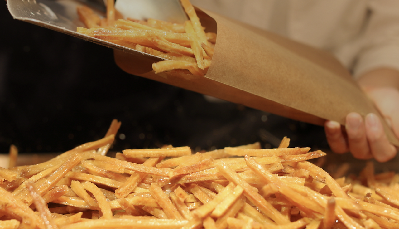 - 중불에서 식용유를 예열한 후, 고구마를 넣고 노릇해질 때까지 천천히 튀기기