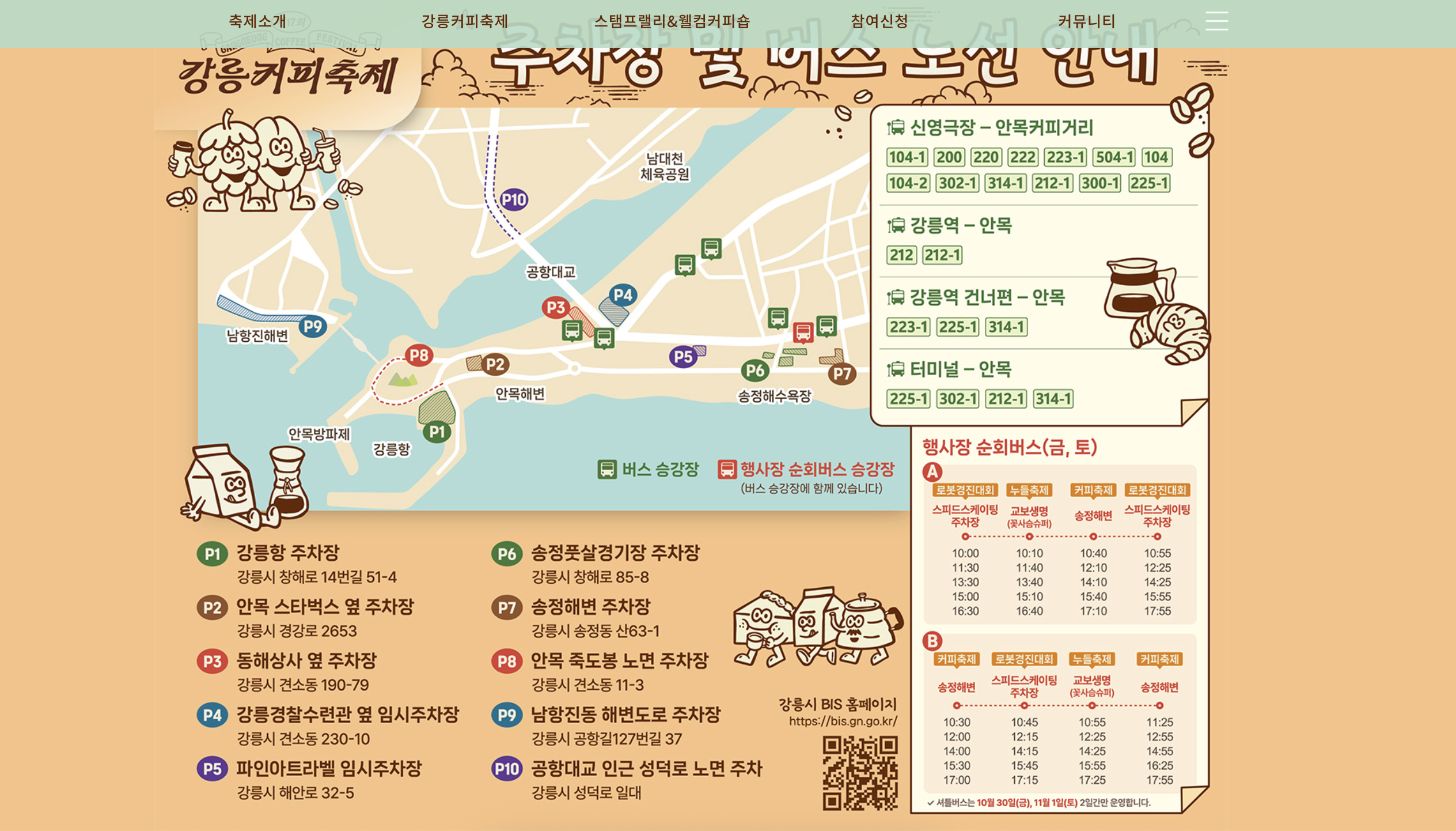 – 셔틀버스 운영: 커피축제(안목 일대) ⇄ 누들축제(월화거리) ⇄ 인근 행사장 연결 셔틀버스 운영 예정. 금요일과 토요일이 특히 붐빕니다.