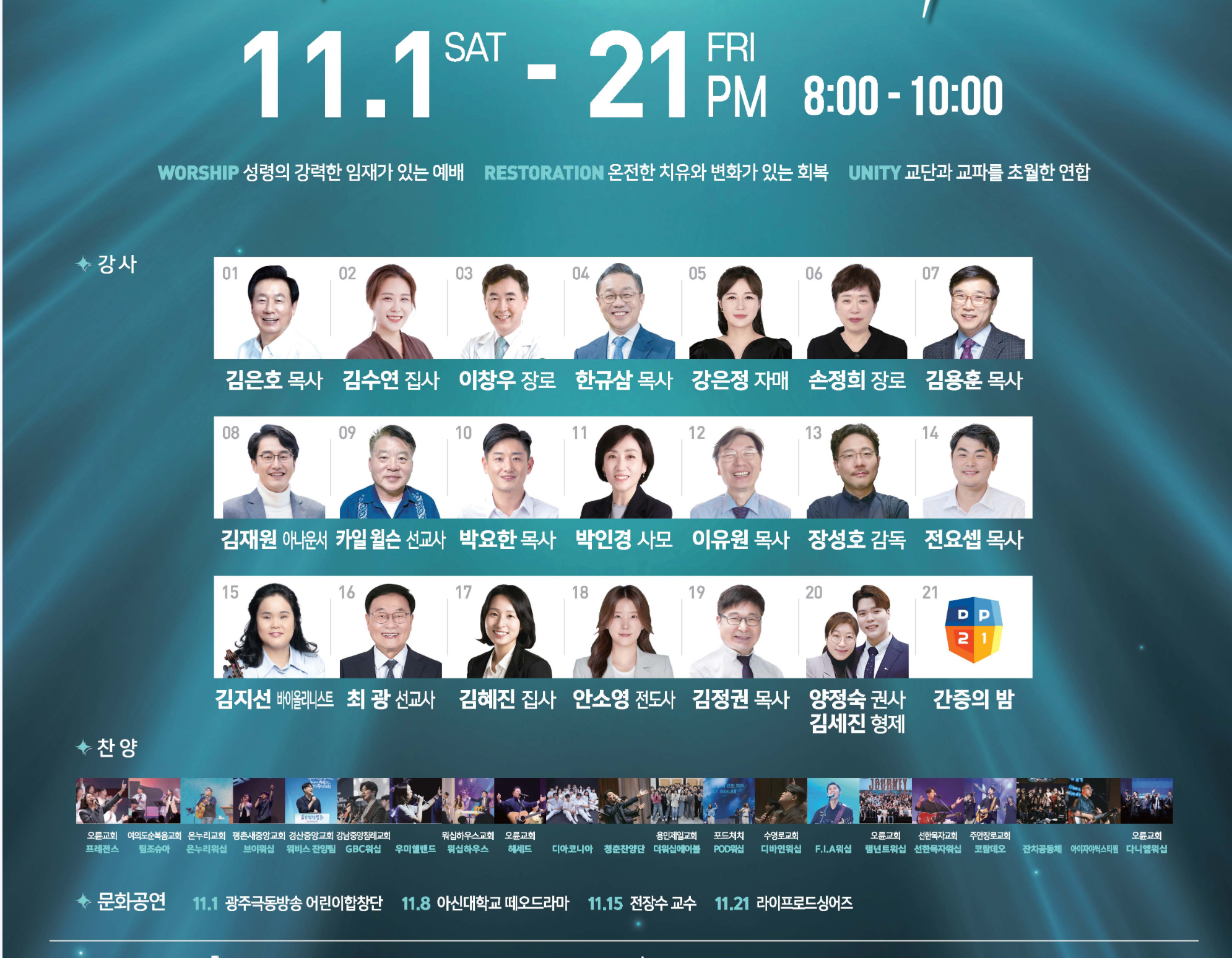 올해 강사진은 목회자, 선교사, 평신도 사역자, 방송인 등 다양한 영역에서 활동 중인 21인의 강사로 구성되어 있어, 더욱 풍성하고 균형 잡힌 영적 메시지를 제공합니다.