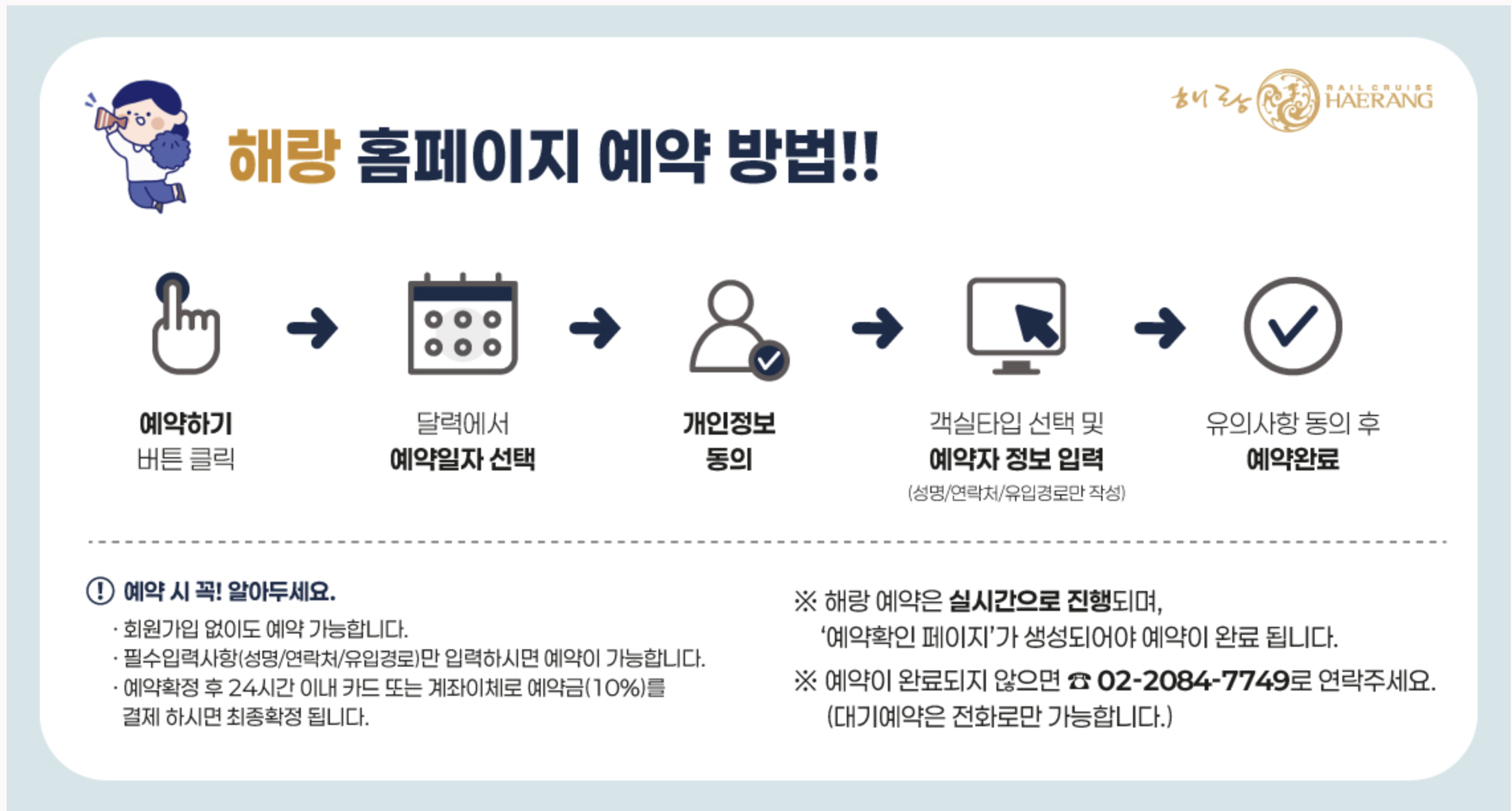 - 코레일관광개발 '레일크루즈 해랑' 공식 홈페이지를 통한 온라인 예약이 기본입니다.