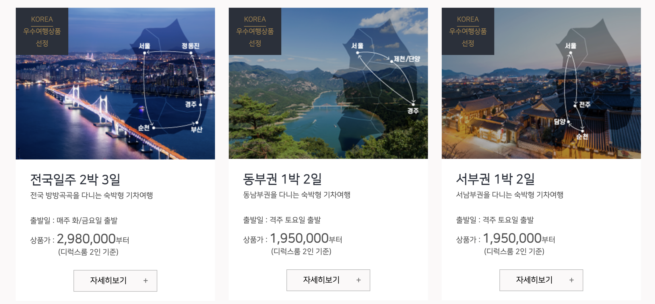 | 전국일주 | 2박 3일 | 대한민국의 대표적인 동/서/남부 주요 명소를 가장 폭넓게 경험하는 코스 | 매주 화/금요일 |