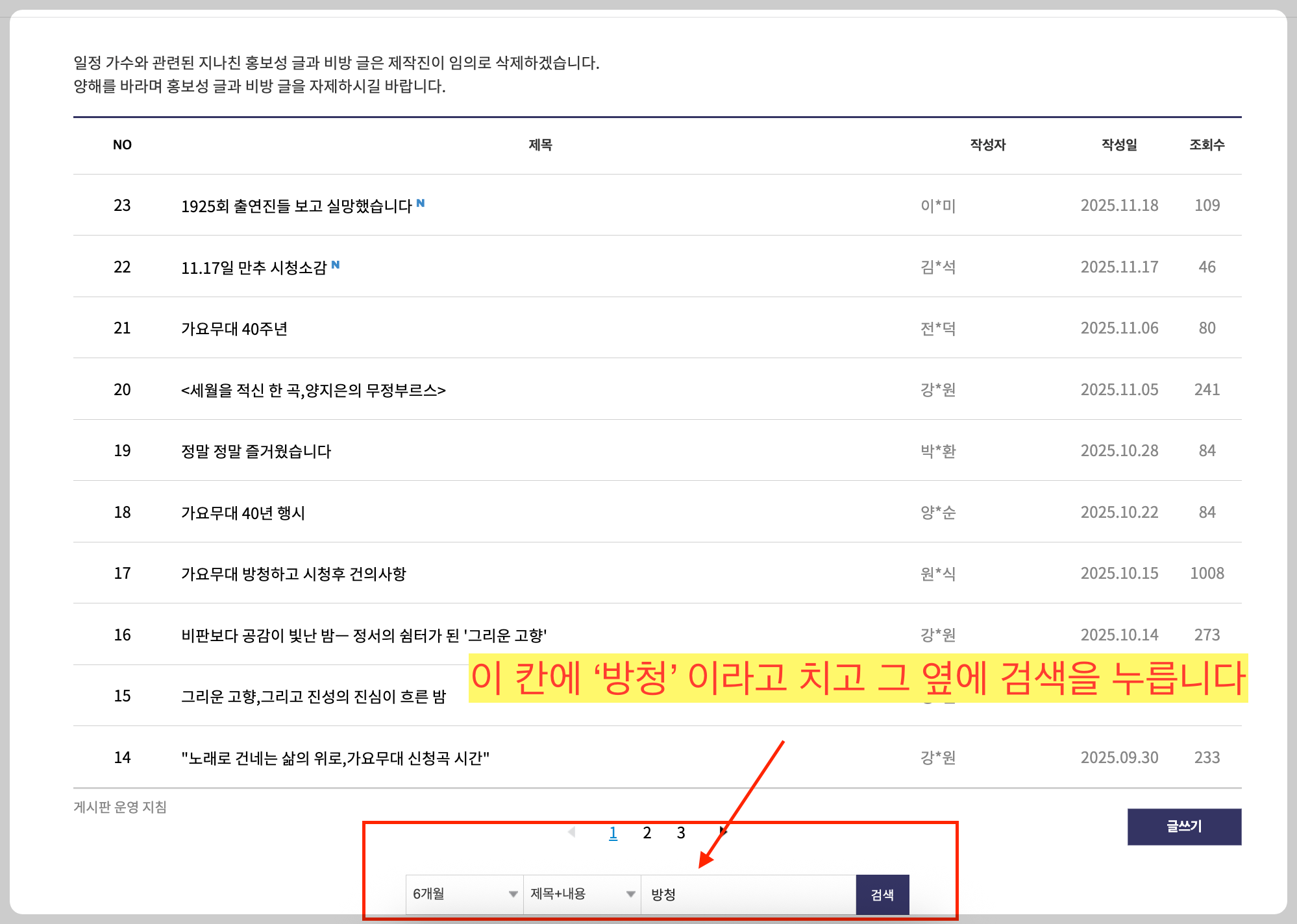 ◼️게시판에서 '방청'에 관련된 글만 따로 추려내기