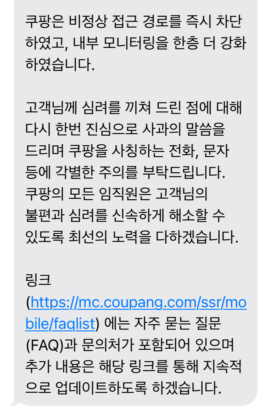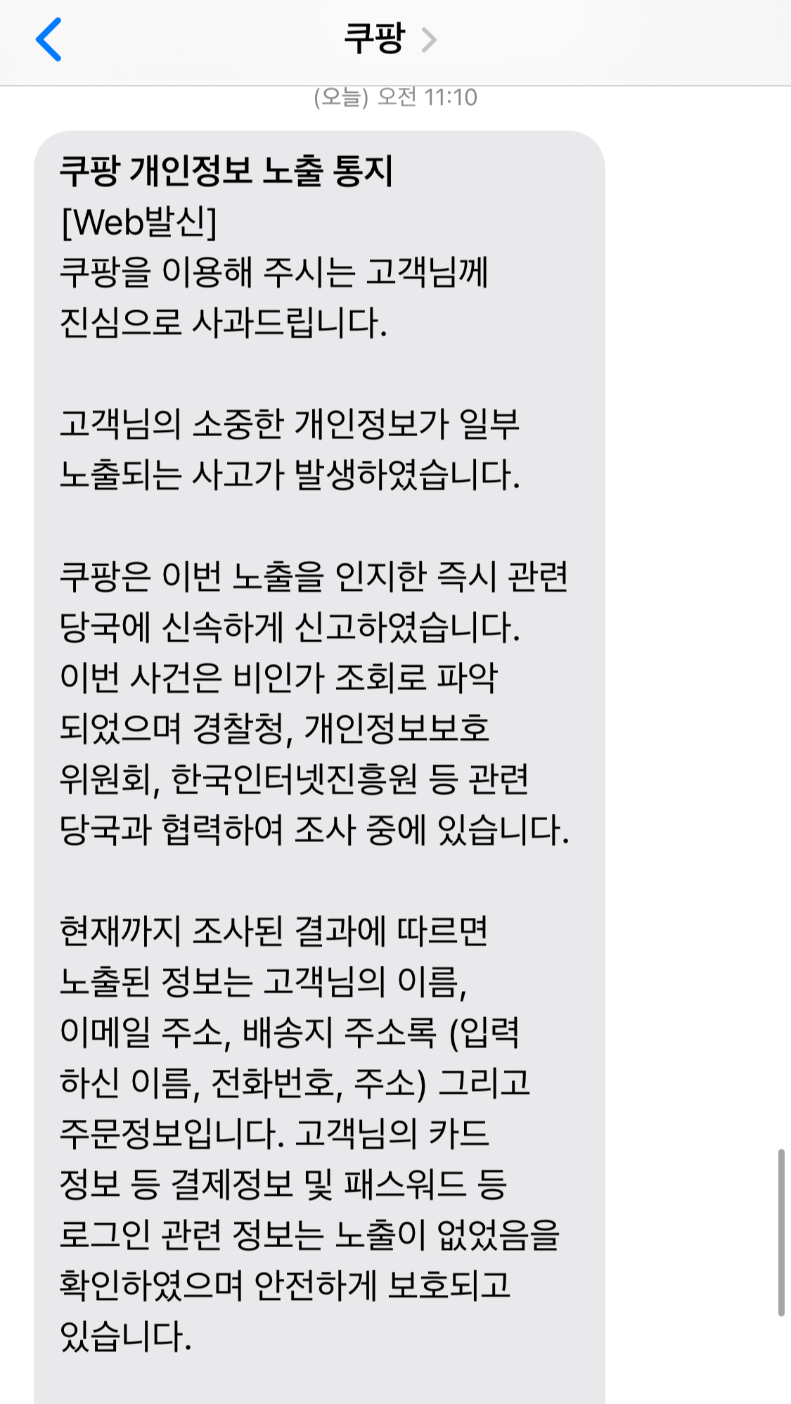 저는 오늘 오전에 아래와 같이 쿠팡측으로부터 쿠팡 개인정보 노출 통지 문자를 받았습니다.