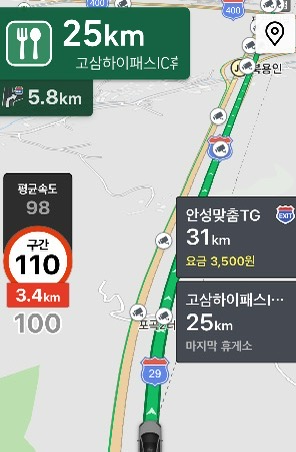 👉앞으로 31km 달리면 안성맞춤 톨게이트(약자로 TG)를 통과할건데, 요금은 3,500원이라는 뜻입니다 - 요즘 많이들 하이패스를 쓰지만 혹시 톨게이트 요금을 현금으로 낼 거면 미리 준비해두시면 되겠습니다.
